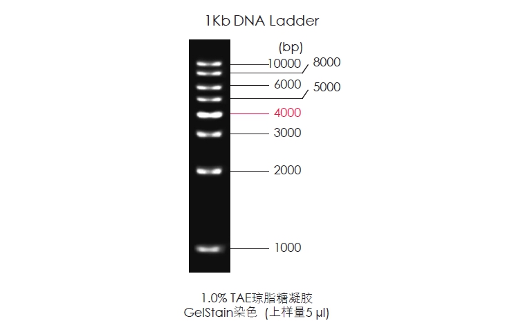 1 Kb DNA Ladder是由8條線狀雙鏈DNA條帶組成,適用于瓊脂糖凝膠電泳中DNA條帶的分析,不建議用于聚丙烯酰胺凝膠電泳。本產(chǎn)品為即用型產(chǎn)品,已含有1×Loading Buffer,可根據(jù)實驗需要,直接取5 μl電泳,使用方便,電泳圖像清晰。其中4000 bp條帶為100 ng/5 μl,顯示亮帶,其余條帶濃度為50 ng/5 μl。