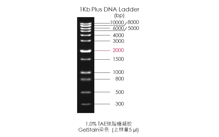 1 Kb Plus DNA Ladder是由12條線狀雙鏈DNA條帶組成,適用于瓊脂糖凝膠電泳中DNA條帶的分析,不建議用于聚丙烯酰胺凝膠電泳。本產(chǎn)品為即用型產(chǎn)品,已含有1×Loading Buffer,可根據(jù)實驗需要,直接取5 μl電泳,使用方便,電泳圖像清晰。其中2000 bp條帶為100 ng/5 μl,顯示亮帶,其余條帶濃度為50 ng/5 μl。便于準確判斷目的產(chǎn)物DNA的量。