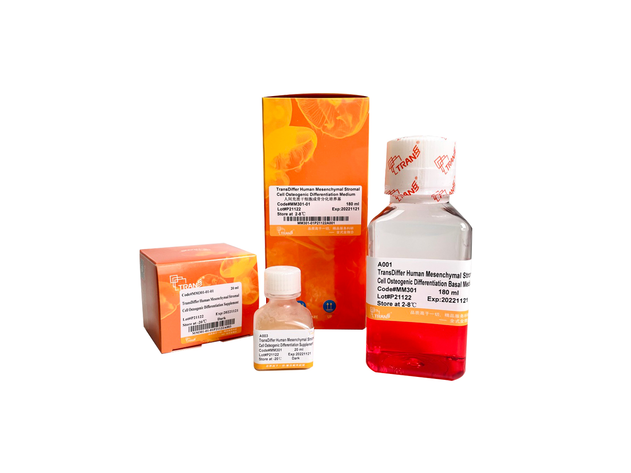 TransDiffer? Human Mesenchymal Stromal Cell Osteogenic Differentiation Medium是一種含血清的完全培養(yǎng)基,適用于將人間充質(zhì)干細(xì)胞(Human Mesenchymal Stromal Cells, MSCs)向成骨細(xì)胞分化。本試劑盒普適性強(qiáng),適用于多種培養(yǎng)體系(含血清及無血清)培養(yǎng)的不同來源(人多能性干細(xì)胞衍生、骨髓、臍帶、脂肪來源)的MSCs。本產(chǎn)品穩(wěn)定性好,配制好的完全培養(yǎng)基可于2-8℃穩(wěn)定保存1個月。本產(chǎn)品分化效率高,可用于間充質(zhì)干細(xì)胞多向分化潛能鑒定中成骨分化的鑒定。